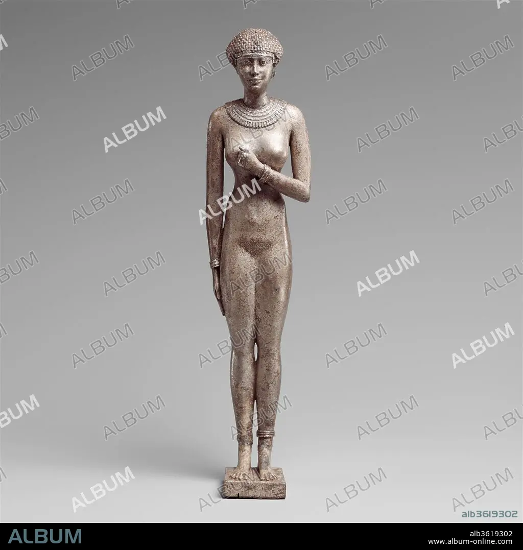 This nude sensual female figure has the cartouches of Necho II on her upper arms. A small tightly fitted wig caps her head, and two holes with silver wires are located in the wig over her forehead; their placement suits a uraeus. She wears a finely wrought broad collar plus earrings (only one of which is preserved), bracelets and anklets.