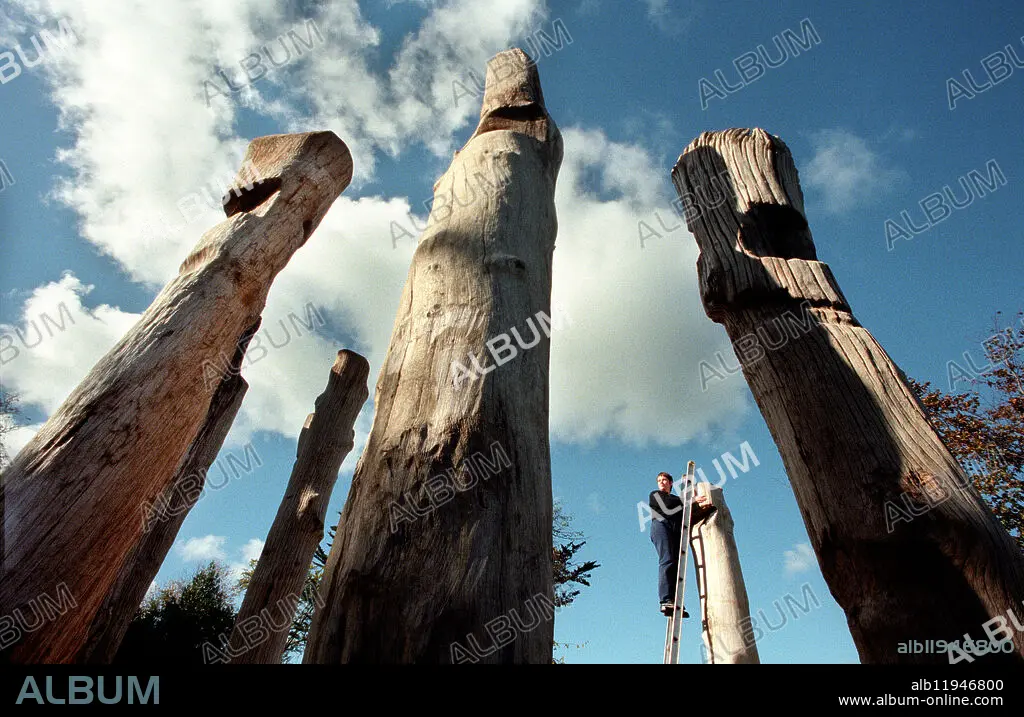 One young woman inspecting Eighteen Thousand Tides a sculpture by David Nash of old seafront groynes,