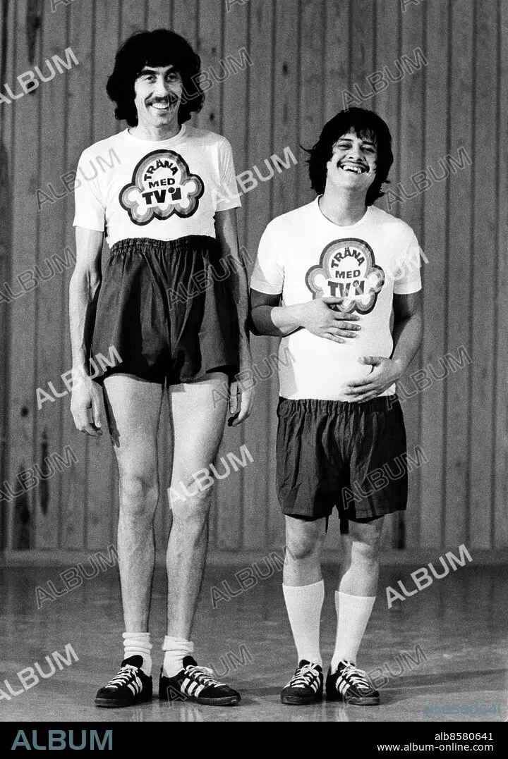 ARKIV 197501.. Skådespelaren Lasse Åberg (t.v.) och konstnären Ardy Strüwer i programmet Träna med TV 1 från 1975.. Foto: Bertil S-son Åberg / SVT Bild / Kod: 5600. RiR sv/v 21408. RiR nr. 6/75, 33/75. Mapp: Lasse och Ardy Träna med TV 1975
