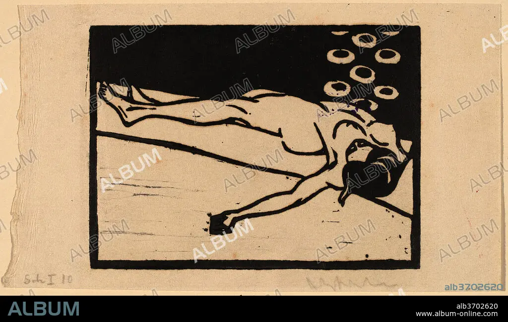 ERNST LUDWIG KIRCHNER. Reclining Nude. Dated: 1905. Dimensions: image: 9.5 x 13 cm (3 3/4 x 5 1/8 in.) sheet: 11.2 x 19 cm (4 7/16 x 7 1/2 in.). Medium: woodcut printed in black.