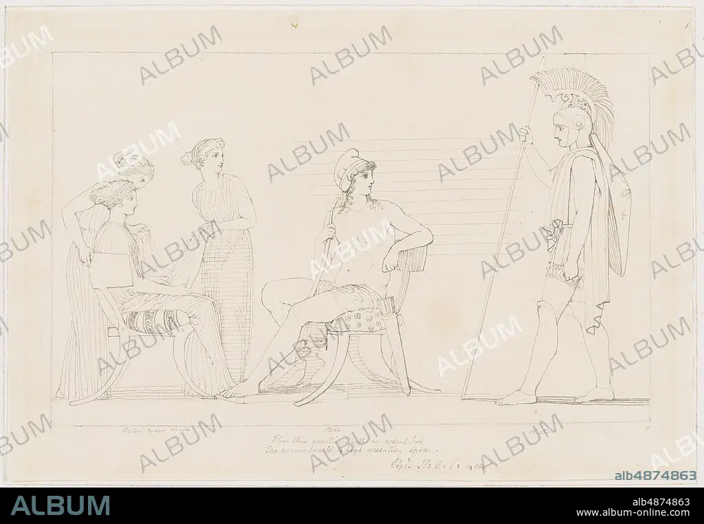 John Flaxman, Hector Chiding Paris, 1792-1793, pen and grey ink, brush and black ink over graphite on wove paper, 8 3/8 in. x 12 1/8 in. (21.27 cm. x 30.8 cm.), This drawing by the English Neoclassical sculptor and illustrator John Flaxman conjures a scene from Homer's 'Iliad', the first book the artist illustrated to great acclaim. (His later projects included Dante's 'Divine Comedy,' and Aeschylus.) Commissioned by Mrs. Hare-Naylor in 1792 or 1793 and created in Rome, Flaxman's drawing for the 'Iliad' shows the Trojan leader Hector chastising Paris for defending Troy haphazardly. Flaxman used this drawing as a preparatory study for the published engraving of the encounter. The final work is simplified even further, as it drops Helen's maids and presents the nude, effeminate Paris resting on a bow, his head lowered in shame. Flaxman's drawings of classical scenes and his designs for Josiah Wedgwood's ceramic wares sparked a craze throughout Europe for his silhouetted figures, which Flaxman had developed from engravings of Greek vases.