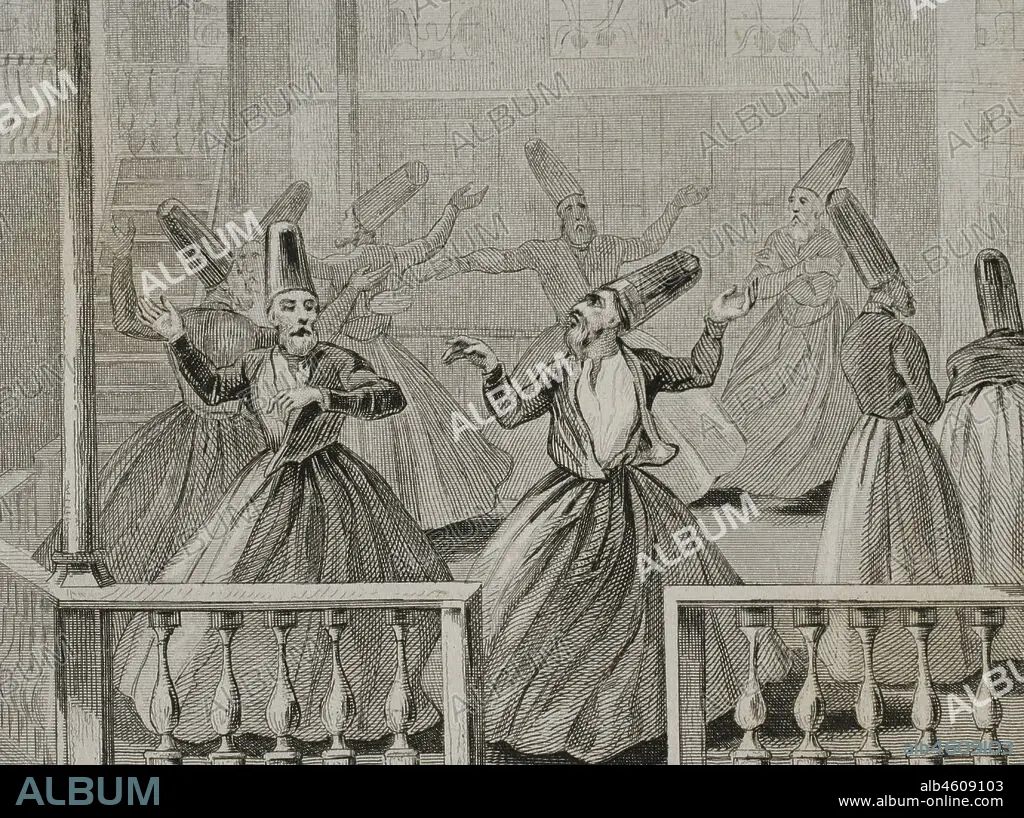 Ottoman Empire. Turkey. Whirling Derviches. Mevlevi Order. The whirling dervishes were founded by Jelaluddin Rumi (1207-1273). Engraving by Lemaitre, Vernier and Monnin. Historia de Turquia by Joseph Marie Jouannin (1783-1844) and Jules Van Gaver, 1840.