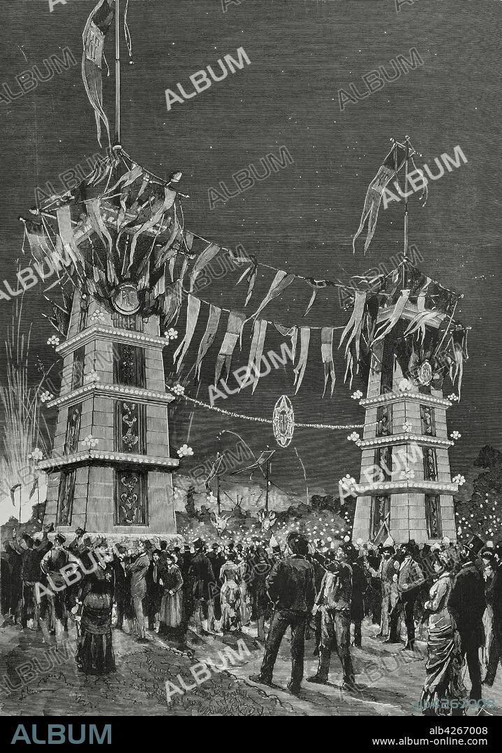 France, Paris. Bastille Day (July 14). Venetian lighting of the Avenue du Bois de Boulogne. Life drawing by Pellicer. Engraving by Bernardo Rico y Ortega (1825-1894). La Ilustracion Espa–ola y Americana, 1881.