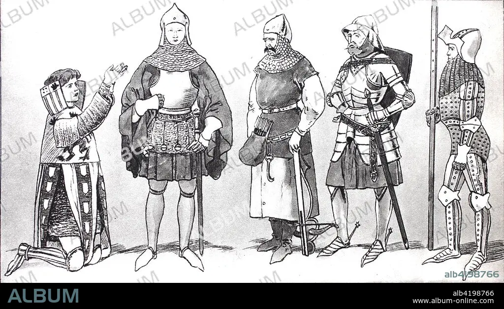 Clothing, fashion, knights costumes in the late Middle Ages, from the left, Burgundian young knights in the 14th century, knights with a peal belt around 1350, Polish crossbowmen in the 14th century, a polish nobleman in the 15th century and a soldier knight around 1375, digital improved reproduction of an original print from the 19th century