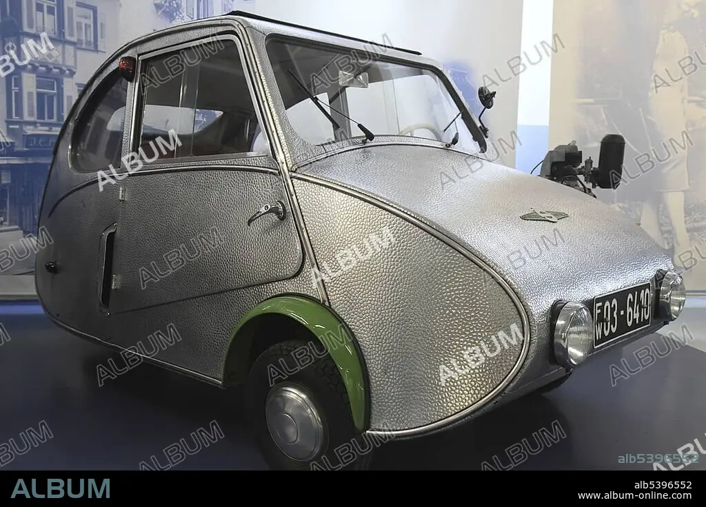 Fuldamobil N4, built in 1954 by Elektromaschinenbau GmbH Fulda, timber chassis with aluminum plate, ErfinderZeiten: Auto- und Uhrenmuseum, Time of Innovators: Museum of Cars and Clocks, Schramberg, Black Forest, Baden Wuerttemberg, Germany, Europe