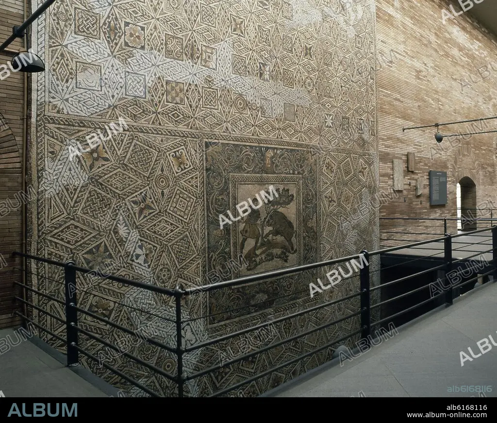 MOSAICO DE LA CAZA DEL JABALI HALLADO EN LA VILLA DE LAS TIENDAS EN LA COMARCA DE MERIDA - SIGLO IV DC