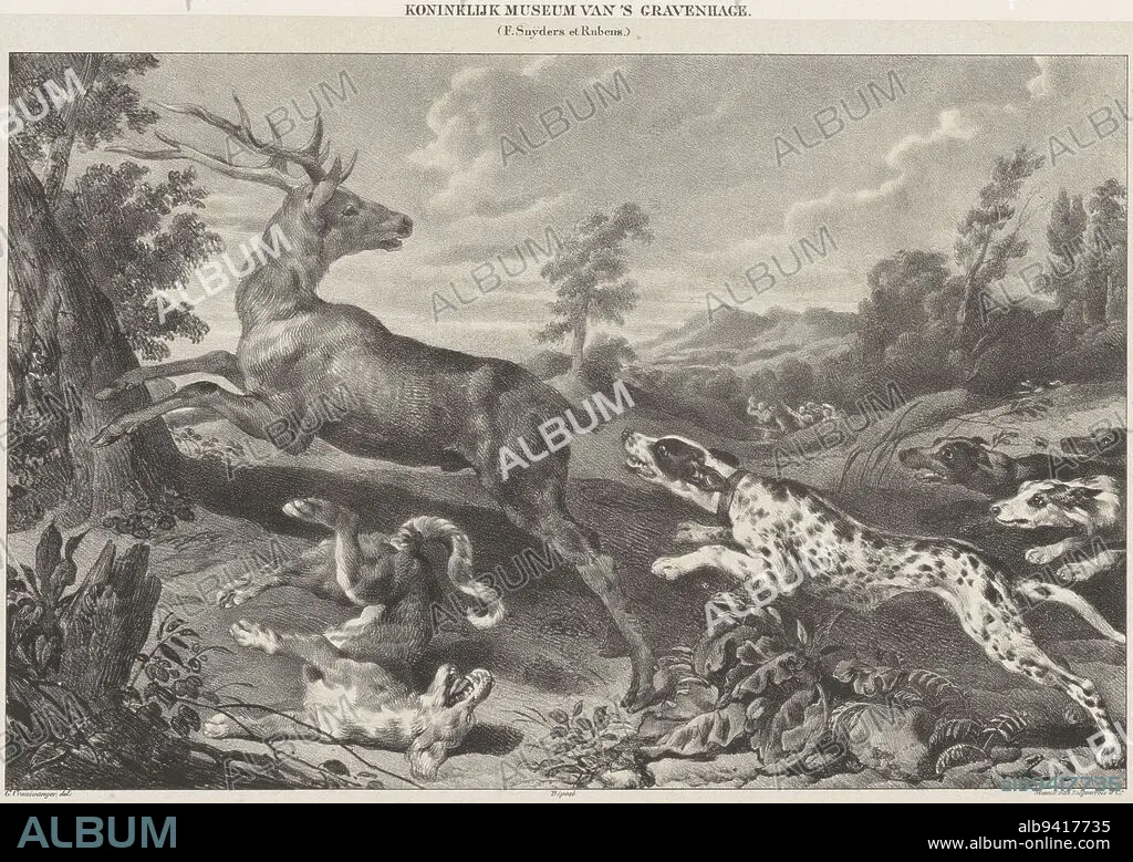 A deer is being chased by a group of dogs. One dog rolls on the ground while another comes close. Further out in the landscape the hunters are running. This print was made after a painting by Paul de Vos and Jan Wildens in the Mauritshuis in The Hague., Deer Hunting A Deer Hunt (title on object) The Royal Museum in The Hague (series title on object), print maker: Gijsbertus Craeyvanger, (mentioned on object), after: Frans Snijders, (rejected attribution), after: Peter Paul Rubens, (rejected attribution), print maker: Netherlands, after: Antwerp, Amsterdam, publisher: Amsterdam, 1833, paper, h 384 mm × w 544 mm