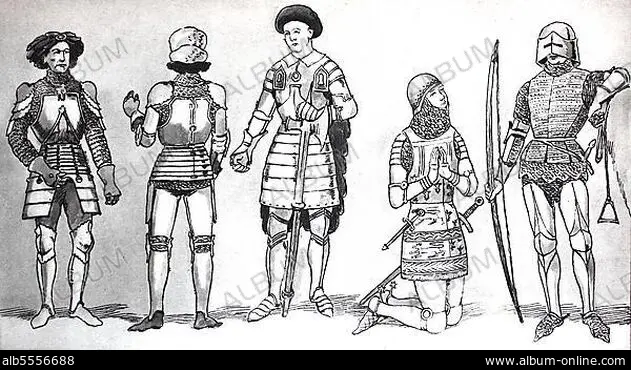 Kleidung, Mode, Ritterkostüme im Spätmittelalter, von links, burgundische Rüstung mit Plattenpanzer über Kettenhemd und Barett um 1450, eine burgundische Rüstung um 1425, eine englische Rüstung im 15. Jahrhundert, eine englische Rüstung mit Kettenhemd, Kettenhaube und über Schienen, im 14. Jahrhundert, ein französischer, berittener und gepanzerter Bogenschütze, digital verbesserte Reproduktion einer Illustration aus dem 19. Jahrhundert