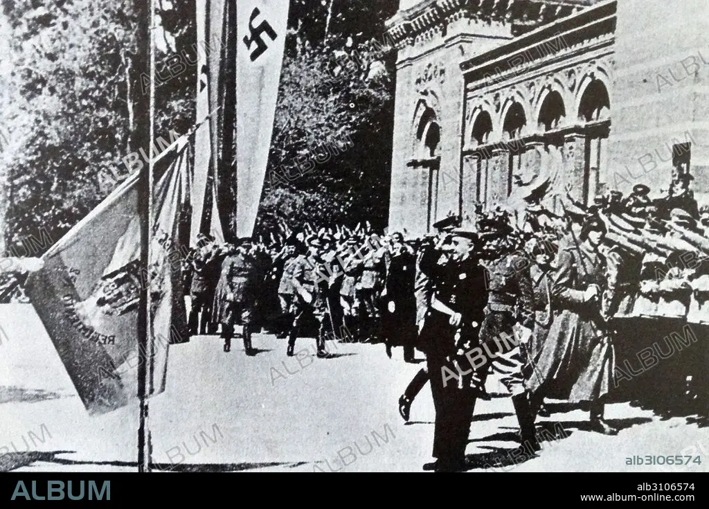 General Franco takes the salute at a parade while German soldiers look on during the Spanish Civil War.