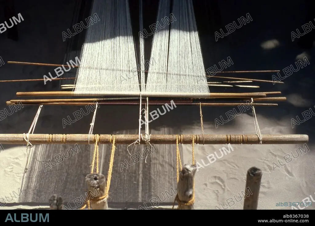 Maldives: A traditional loom for weaving a feyli< / i> or Maldivian sarong, Eydhafushi Island, South Maalhosmadulu Atoll (Baa Atoll),1980