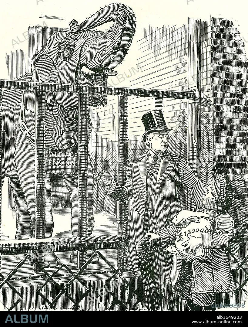 Herbert Asquith, British Liberal Prime Minister, pointing out to John Bull junior just how much the Old Age Pension will cost. Cartoon from 'Punch', London, 13 May 1908.