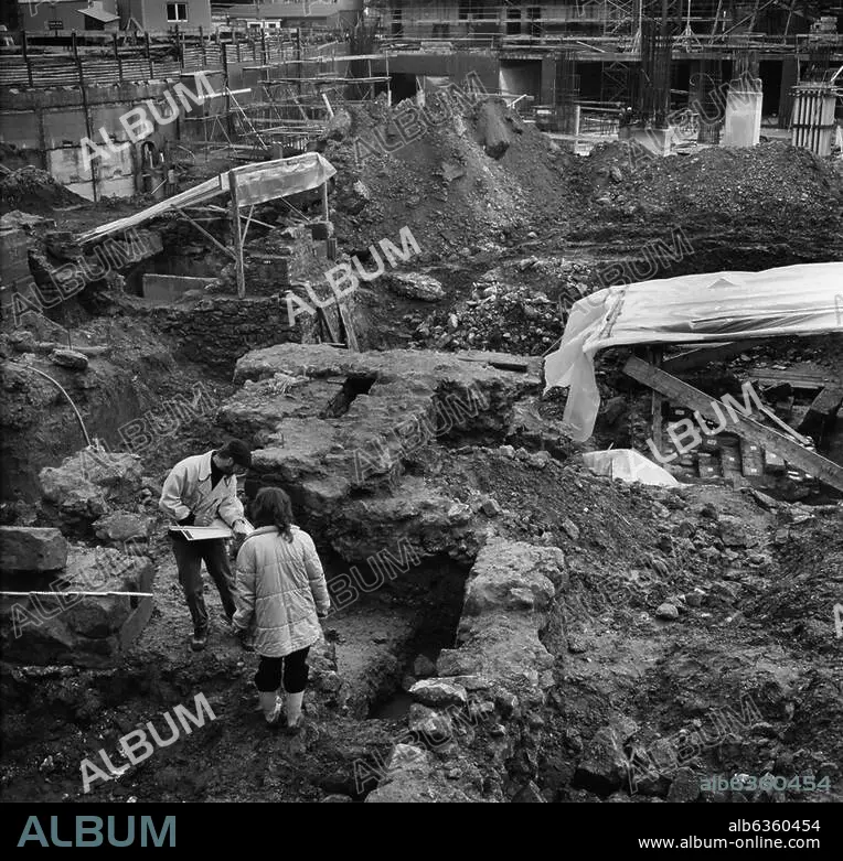 Frankfurt am Main, ehemal. Judengasse. Freilegung von Grundmauern von Wohnhäusern und Ritualbädern bei Ausschachtungsarbeiten für einen Neubau der Stadtwerke Frankfurt am Börneplatz; integriert in das 1992 eröffnete Museum Judengasse. Foto, 1988. Aus dem Projekt: Memorials Archive.