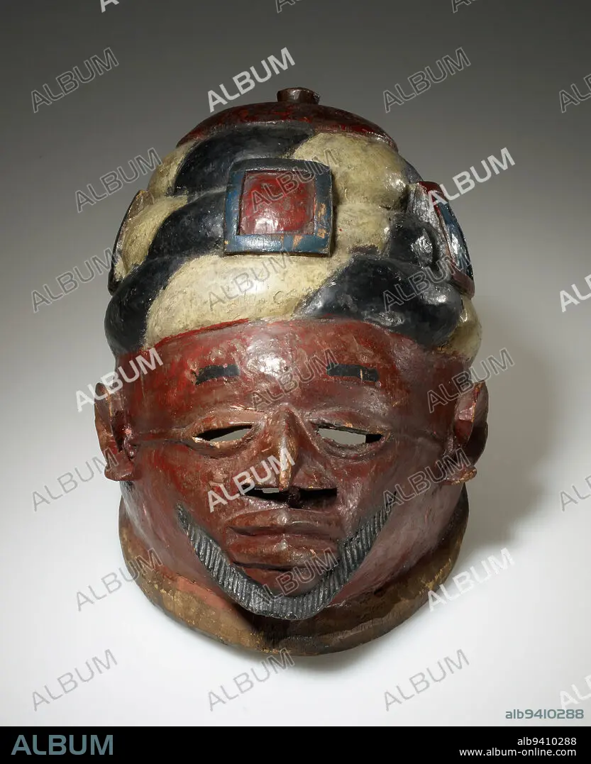 Gelede mask, mid 20th century, 10 1/4 x 12 x 8 3/4 in. (26.04 x 30.48 x 22.23 cm), Wood, pigment, Benin, 20th century, The short beard, pointed nose, and wrapped turban decorated with amulets represent a Muslim cleric. For more than three centuries, Yoruba people have been in contact with Islam and many now practice the faith, occasionally incorporating it into local religious traditions. This mask, for instance, appeared in a performance called Gelede, which celebrates the power of women. The finely carved details and evidence of repainting suggest this was a highly respectedand well-usedmask.