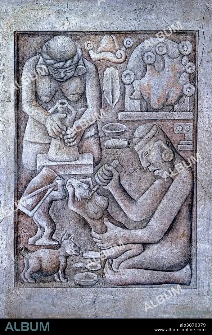 Sculpture workshop, production of sculptures, monochrome fresco painting by Diego Rivera in the arcades of the Palacio Nacional, National Palace, Zoccalo, Mexico City, Mexico, Central America.