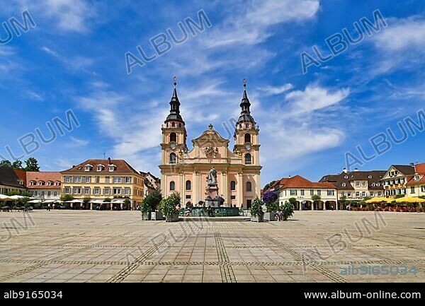 Ludwigsburg, Germany, August 2022: Town square called 'Marktplatz' with protestant church called 'Stadtkirche Ludwigsburg in city center, Europe.