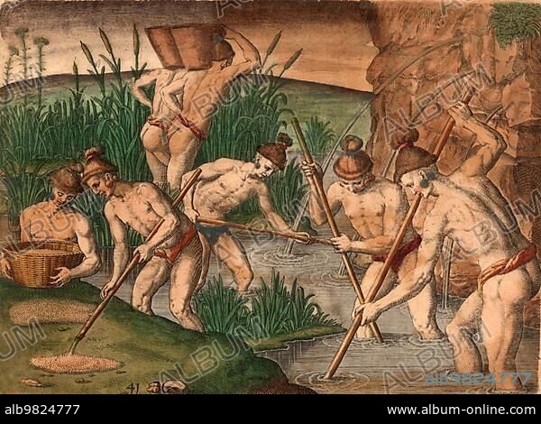 Indians in North America; Native Americans digging for gold. Contains baskets made of bulrushes or reeds; Historic; digitally restored reproduction of an original from the period