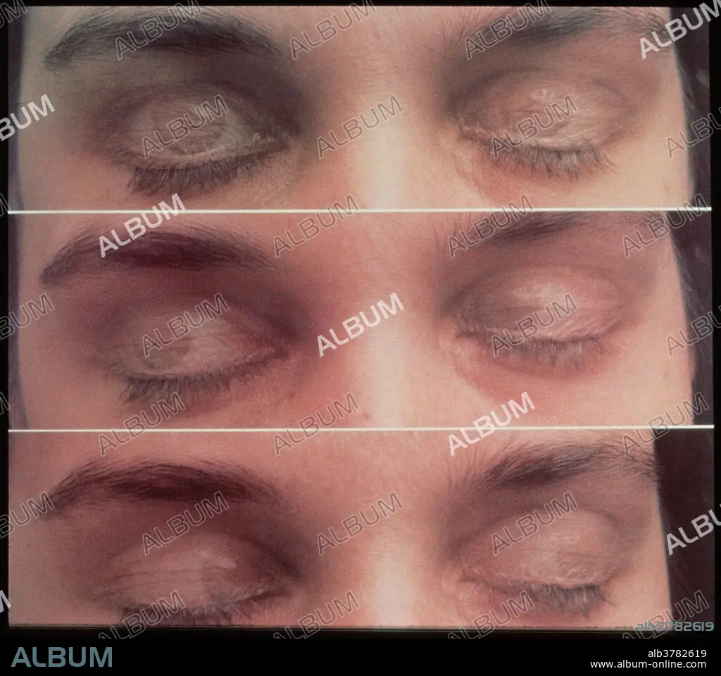 Eye movement during REM sleep. Photograph illustrating REM (Rapid Eye Movement), the deepest of five stages of sleep. During this stage, the muscles of the eyes are in constant motion behind the closed eyelids. People woken abruptly during REM sleep often report that they were dreaming at the time. Photographed using double-exposure techniques.