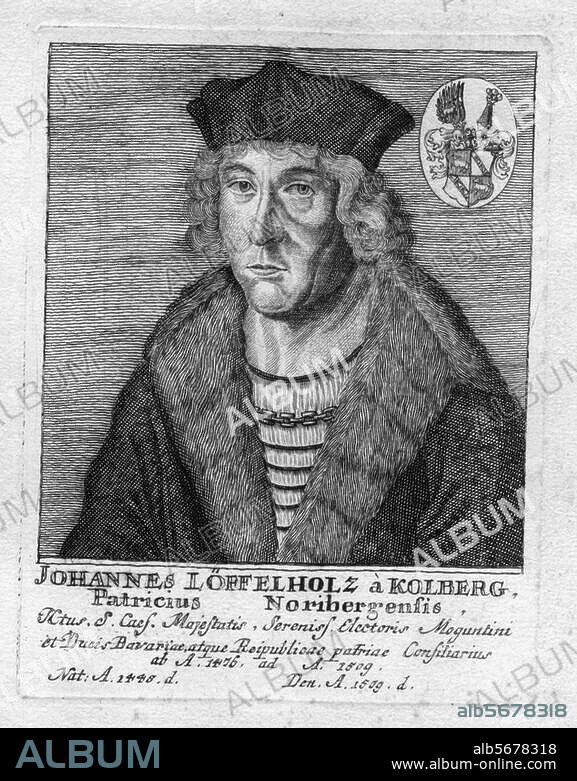 Mensch / Mann:. Bildnisse. - "JOHANNES LÖFFELHOLZ (...) ". (Nürnberger Patrizier und Ratsherr, geb. 1448 in Kolberg, gest. 1509). Kupferstich, unbez., 17. Jh., nach zeitgenössischem Bildnis. 13,4 × 10,4 cm. Berlin, Sammlung Archiv für Kunst und Geschichte.