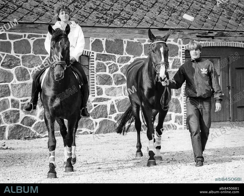 Hasse Borg fotboll Malmö FF MFF 1983. Hasse Borg med fästmö Maria. Hästarna heter Kadrilo (t.v.) och Bajard. (c) Bo-Åke Nilsson / Sydsvenskan / IBL.