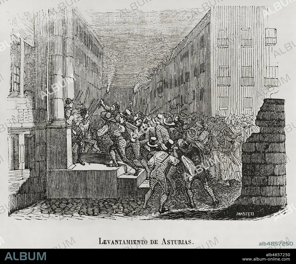 España. Asturias. Invasión napoleónica. Levantamiento de Asturias (15 de mayo de 1808). El pueblo asturiano se sublevó contra las autoridades de la audiencia y la junta general del principado que querían acatar las órdenes del mariscal Murat que llegaban de Madrid. El 25 de Mayo millares de asturianos venidos de muchos lugares asaltaron la fábrica de armas de Oviedo y tomaron la ciudad. Constituyeron un nuevo órgano de gobierno, la Junta Suprema, reconociendo la soberanía popular y declarando la guerra a Napoleón. Grabado. Historia del Levantamiento, Guerra y Revolución de España, por el conde de Toreno. Madrid,1852.