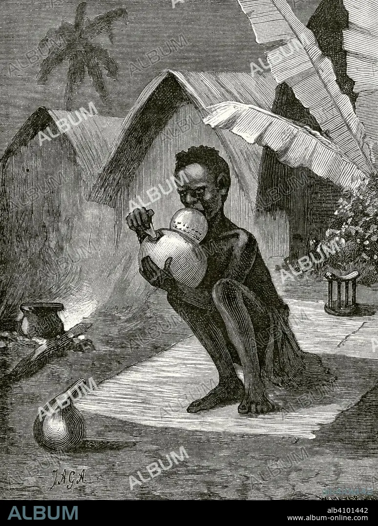 Central Africa. Indigenous smoking Cannabis. Engraving. Africa inexplorada, el Continente Misterioso by Henry Morton Stanley, c. 1887.