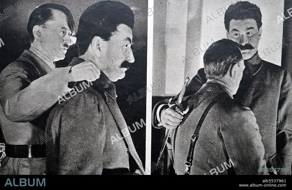 Wax works of Adolf Hitler and Joseph Stalin. Adolf Hitler (20 April 1889 - 30 April 1945) was an Austrian-born German politician who was the dictator of Germany from 1933 until his death in 1945. He rose to power as the leader of the Nazi Party, becoming the chancellor in 1933 and then assuming the title of Fuhrer und Reichskanzler in 1934. During his dictatorship, he initiated World War II in Europe by invading Poland on 1 September 1939. He was closely involved in military operations throughout the war and was central to the perpetration of the Holocaust, the genocide of about six million Jews and millions of other victims. Joseph Vissarionovich Stalin (6 December 1878 - 5 March 1953) was a Georgian revolutionary and Soviet political leader who governed the Soviet Union from 1924 until his death in 1953. He served as both General Secretary of the Communist Party of the Soviet Union (1922-1952) and Chairman of the Council of Ministers of the Soviet Union (1941-1953).