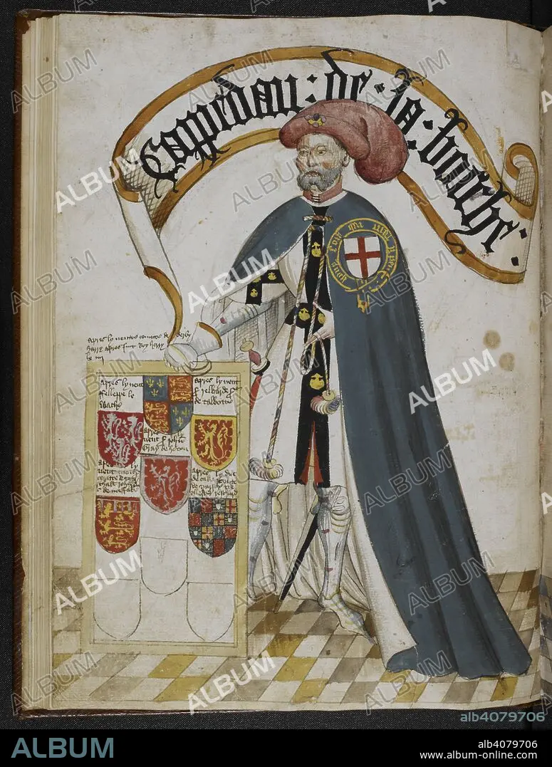 Sir John de Grailly, captal de Buch, a founder Knight of the Order of the Garter, wearing a blue Garter mantle over plate armour and surcoat displaying his arms. Pictorial book of arms of the Order of the Garter ('William Bruges's Garter Book'). England, S. E. (probably London); c. 1430- c. 1440 (before 1450). Source: Stowe 594 f.8v.
