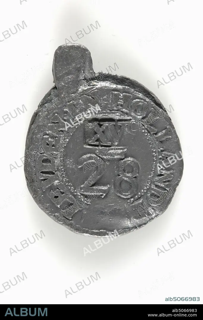 boring lead, Anonymous, minted, General: 3.8 x 3 x 0.3cm (38 x 30 x 3mm), Diameter: 3cm (30mm), city coat of arms, Saing lead with the coat of arms of Leiden under a crown on the front. The circular reads: LEYDEN IN HOLLANDT. On the back is the inscription: 1 1/8 B. Below it is written: DKETE1 / 5 SAY. Below that: 40 1/4. At the very bottom it says: XVc. A number is printed in the lead: 1589, 1904