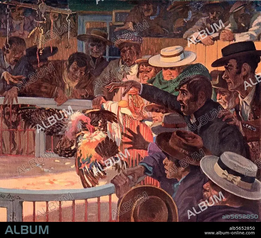 Volkskunde:. Spanien. "Hahnenkampf in Sevilla". Farbdruck, 1910, nach Gemälde von Otto Boyer (1874-1912).