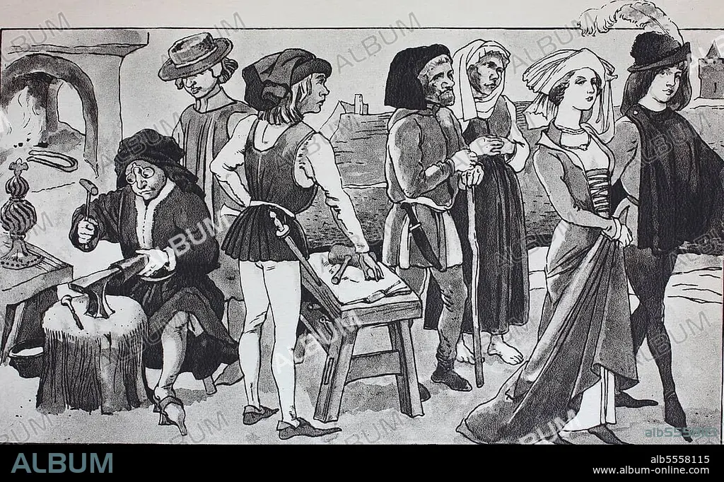Mode, Kleidung in Deutschland im späten Mittelalter, 1475-1500, von links, ein Kupferschmied mit Turbanhaube, ein einfacher Mann, ein Bauer mit seiner Frau und ein junges vornehmes Paar, digital restaurierte Reproduktion einer Originalvorlage aus dem 19. Jahrhundert, genaues Originaldatum nicht bekannt