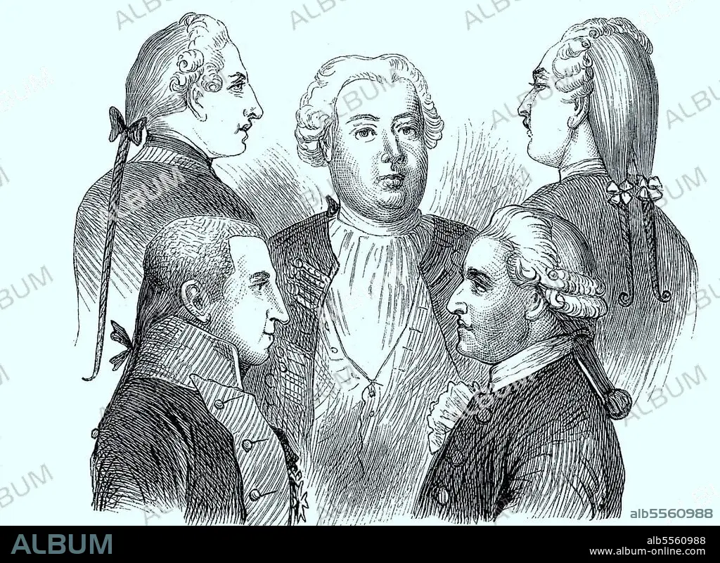 Zopftrachten der Männer, in der Mitte König Friedrich Wilhelm I. Erfinder des Zopf, Historisch, digital restaurierte Reproduktion einer Originalvorlage aus dem 19. Jahrhundert, genaues Originaldatum nicht bekannt