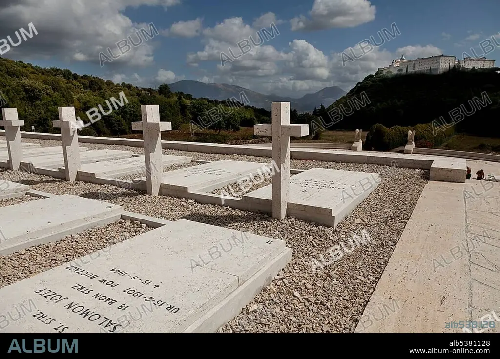 Gravestones on the Polish Cemetery and Monte Cassino Abbey on the mountain in the distance, Cassino, Lazio, Italy, Europe.