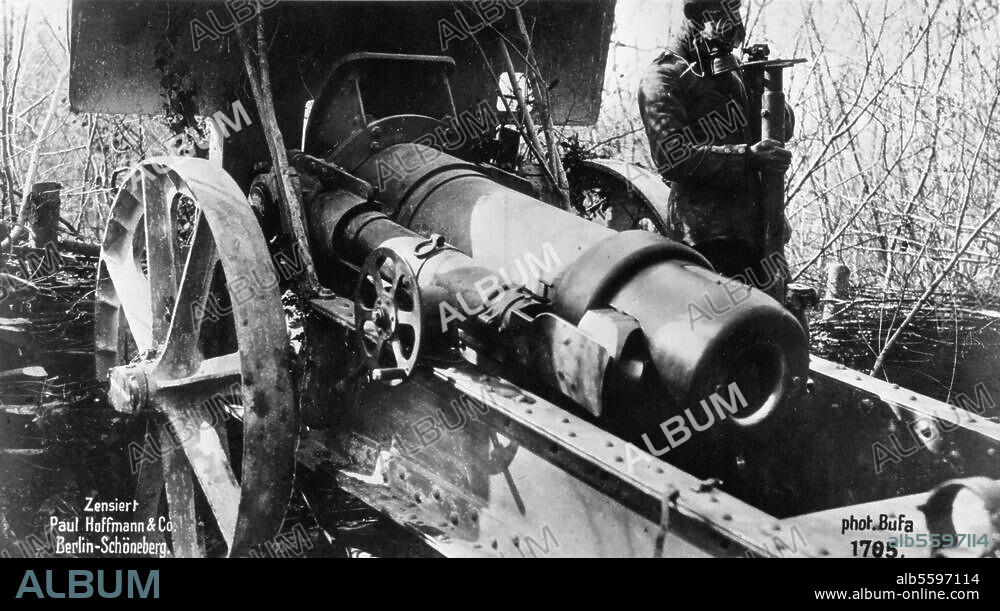 1. Weltkrieg / Westfront. Wachthabender Artillerist mit Gasmaske an einem schweren Geschütz auf dem westlichen Kriegsschauplatz. Foto, um 1917.