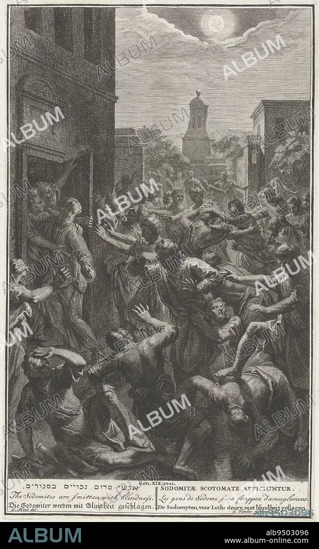Sodomites struck with blindness, Gilliam van der Gouwen, after Gerard Hoet (I), 1728, Two angels are attacked by the inhabitants of Sodom. The Sodomites are struck with blindness (Gen. 19:10-11). The print has a Hebrew, Latin, French, English, German and Dutch caption., print maker: Gilliam van der Gouwen, (mentioned on object), intermediary draughtsman: Gerard Hoet (I), (mentioned on object), publisher: Pieter de Hondt, print maker: Amsterdam, publisher: The Hague, 1728, paper, engraving, etching, w 215 mm × h 355 mm