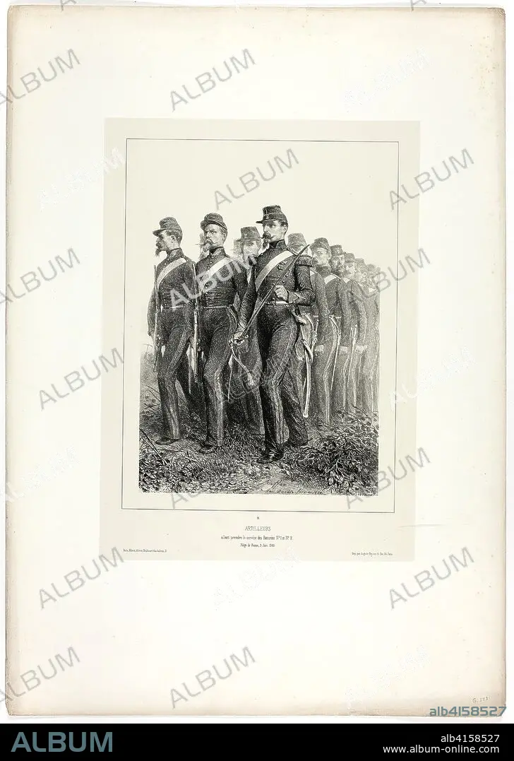 Artillery men, from Souvenirs d'Italie: Expédition de Rome. Denis Auguste Marie Raffet (French, 1804-1860); printed by Auguste Bry (French, 19th century); published by Chez Gihaut Frères (French, 19th century). Date: 1858. Dimensions: 232 × 192 mm (image); 355 × 254 mm (primary support); 570 × 402 mm (secondary support). Lithograph in black on ivory wove chine laid down on ivory wove paper. Origin: France.