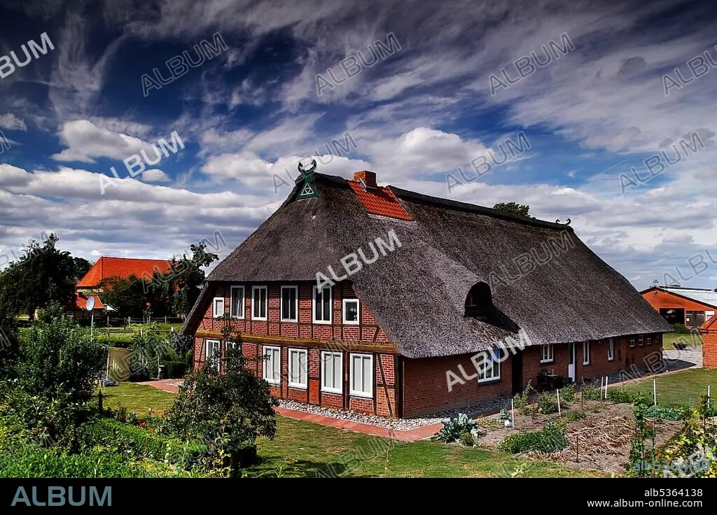 Thatched hall house in the marshland village of Konau, brick house, Elbe dike, Elbe cycle path, column path, perforated plate path, inner-German border fortification, Green Belt, border path, UNESCO Biosphere Reserve Elbe River Landscape, Konau, Haar, municipality Amt Ne