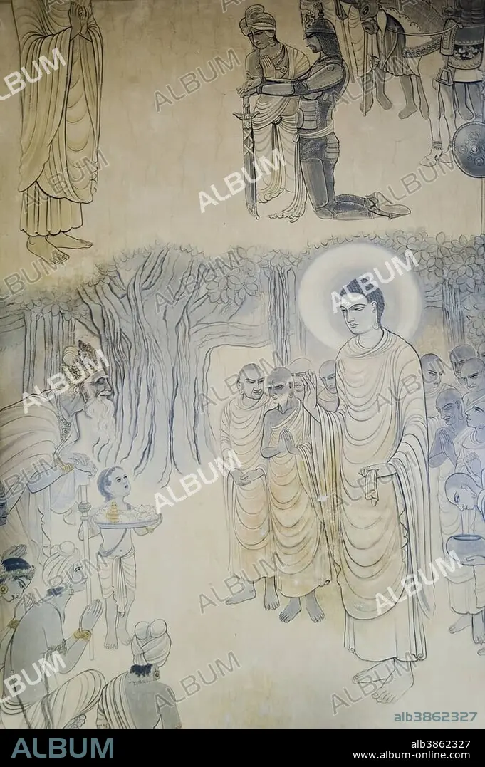 Buddha with his disciples, detail of a wall painting of the Japanese artist Kosetsu Nosu representing the Life of Buddha, Mulagandha Kuti Vihara Buddhist temple, Sarnath, Uttar Pradesh, India, South Asia, Asia