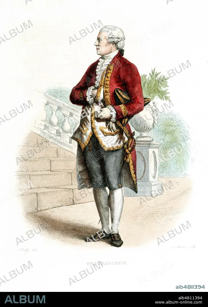 Portrait de Pierre Augustin CARON de BEAUMARCHAIS, ecrivain et auteur dramatique francais (1732-1799). Gravure de Julien BOILLY (1796-1874) in Le Plutarque Francais, vies des hommes et des femmes illustres de la France avec leurs portraits en pied, 1840. Credit: Collection Grob/ Kharbine Tapabor.