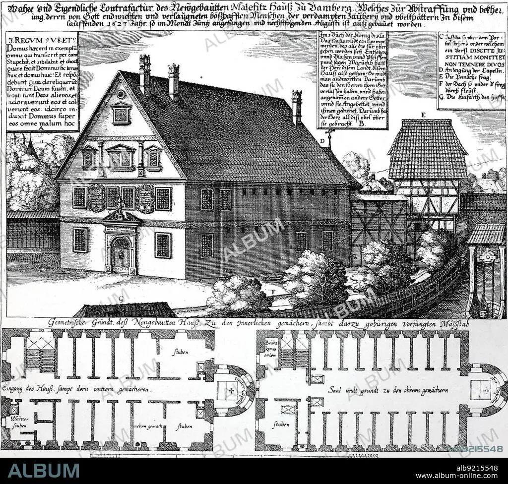Copper engraving from the Drudenhaus, Malefizhaus, Trudenhaus, Hexenhaus, Hexengefängnis from 1627 in Bamberg built by Prince Bishop Johann Georg II Fuchs of Dornheim, Germany, historical image or illustration, published 1890, digitally improved, Copper engraving from the Drudenhaus, Witch prison from 1627 in Bamberg built by Prince Bishop Johann Georg II Fuchs of Dornheim, Germany, historical image or illustration, published 1890, digitally improved, Europe