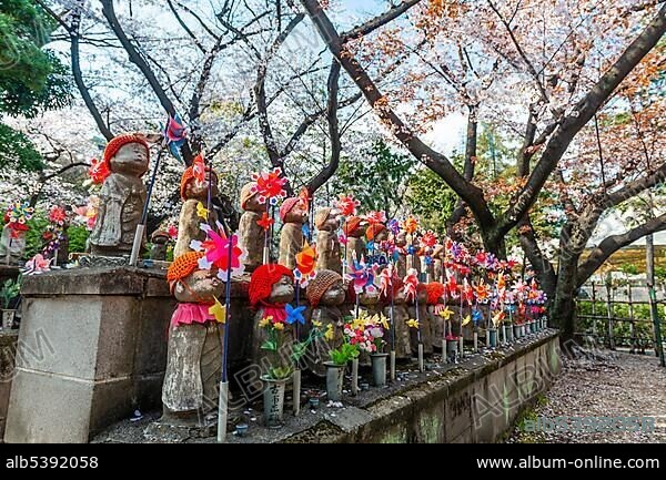 Jizo statues with red caps, protective deities for deceased children, Unborn Children Garden. ZÅjÅji Temple, Buddhist Temple, Tokyo, Japan, Asia