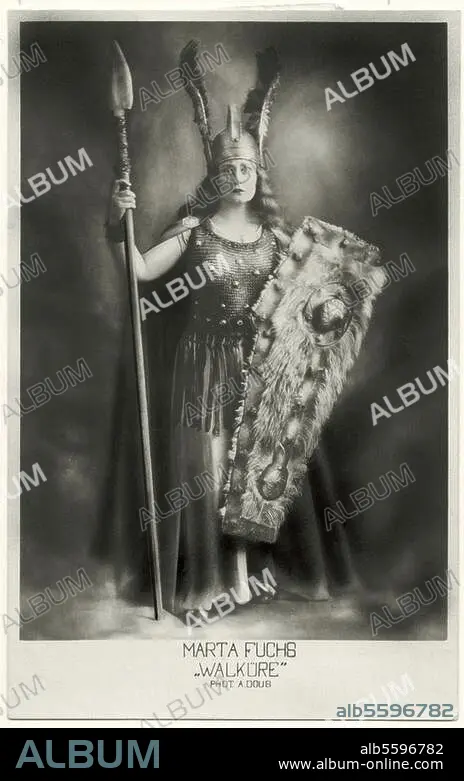 Wagner, Richard; Komponist; 1813-1883. Werke: Die Walküre (UA 1870). Rollenbild der Sopranistin Marta Fuchs (1898-1974) als "Brünnhilde". Foto, Dresden (?) 1935 (A.Dous). Rückseitig mit handschriftl. Widmung:. "Herrn Egisto Pick (...) Marta Fuchs 18.5.35". Berlin, Sammlung Archiv für Kunst und Geschichte.