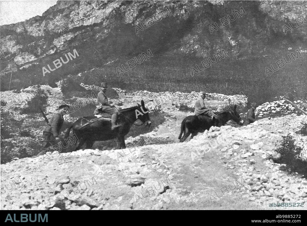 'Sur le front Italien, apres Gorizia ; Le general Cadorna, a dos de mulet et suivi d'un officier d'ordonnance, visitant les lignes du Trentin', 1916. From "L'Album de la Guerre 1914-1919, Volume 1" [L'Illustration, Paris, 1924].