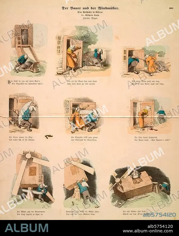 Busch, Wilhelm; 1832-1908. Werke: Busch-Bilderbogen (Münchener Bilderbogen 1859-1871). "Der Bauer und der Windmüller. Eine Geschichte in Bildern. Zweiter Bogen". Holzstiche, koloriert, nach Zeichnungen von Wilhelm Busch. Verse von Wilhelm Busch. München (Braun und Schneider), Münchener Bilderbogen Nr. 301. Berlin, Sammlung Archiv für Kunst und Geschichte.