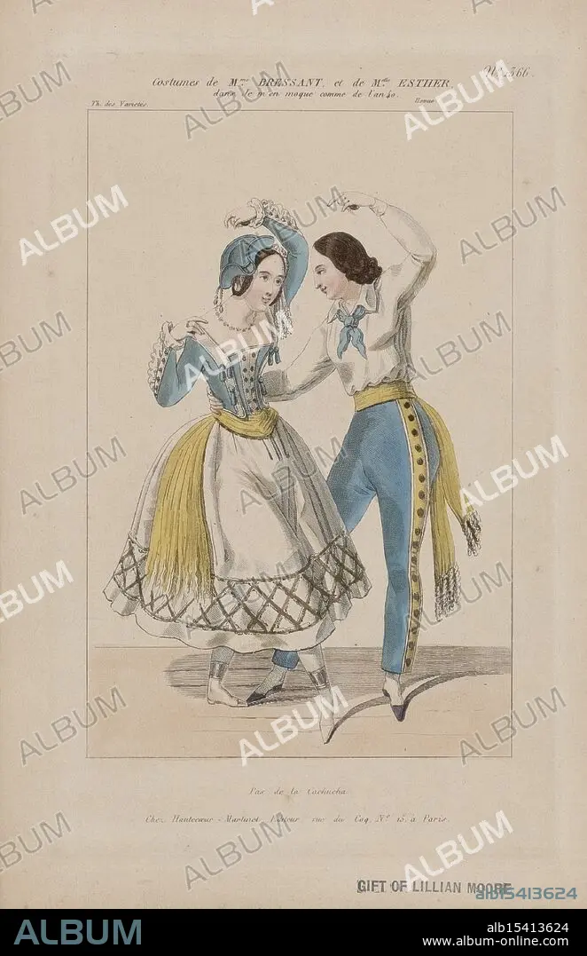 Costumes of Mme Bressant, and of Miss Esther, in Je m'en mock comme de l'an 40. Revue., 1830 - 1840, Costumes of Mme Bressant, and of Miss Esther, in Je m'en mock comme de l'an an 40. Revue., Additional title: Cachucha., Date Issued:1830 - 1840, (Inferred), Place: Paris, Publisher: Hautecoeur-Martinet, Mlle, Cachucha (Choreographic work: Elssler), Ballet, 19th century, Costume designs, Etching, hand-colored, Extent: 20 x 12.7 cm., Silken steps unfold, Esther's dress, a dancer's, Parisian charm flows.