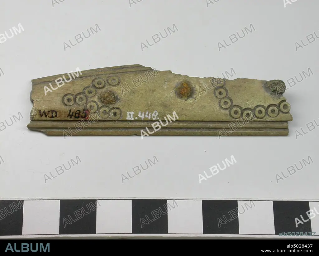 Fragment of a one-sided three-layer comb: part of a handle blade. Type: long comb. Decoration: handle leaf: dot circles forming a lying S and a lying V-shaped pattern. Lines that run parallel to the edges. Shape: straight base, slightly curved top. Tooth plates: 0. End plates: 0. Teeth: 0. Rivets: 3. Thin handle blade. Saw marks: So first the teeth plates and the handle blades have been attached to each other and then the teeth sawn in., Comb fragment, organic, antlers, l = 7,5 cm and b = 2,2 cm., Vmec 800-900