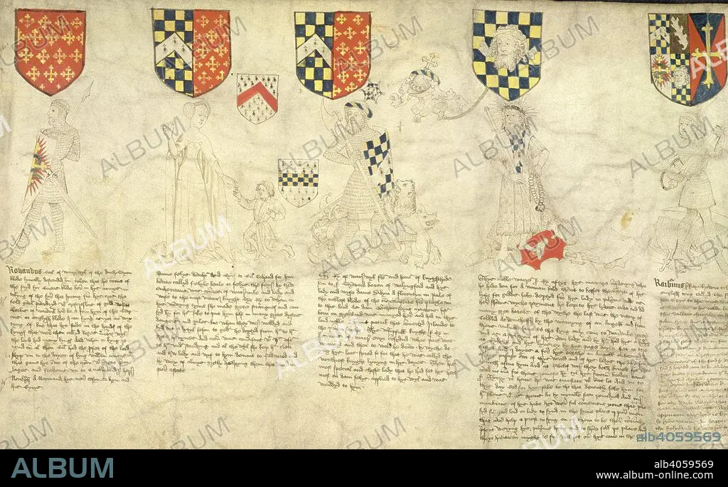 (Figures from left to right): Fig. 19: Rohand, Earl of Warwick. In chain armour, with shield. Fig.20: Dame Felice, his daughter, wife of Sir Guy (in her right), Earl of Warwick. She receives from the herdsman the ring sent to her by her husband, just before his death. Fig.21: Guy, Earl of Warwick. In chain armour; holding a battle-axe and shield. At his feet lies a group of monsters of which he rid the world. Fig.22: Guy, Earl of Warwick, holding a staff and rosary; his head irradiated. At his feet, Colbrond the Danish giant whom he slew at Winchester. Fig.23: Rainburn, Earl of Warwick, son of Sir Guy and Lady Felice. He hold a sword. Unknown slain figure at his feet. He earned for himself in Russia the reputation of a valiant knight, from having slain many giants in single combat. The Rous Roll. Illustrated armorial roll-chronicle by John Rous. England [Warwick]; 1483-1485. Some of the text in the caption is from the original manuscript. Source: Add. 48976 ff.20-23 Figures 19-23.