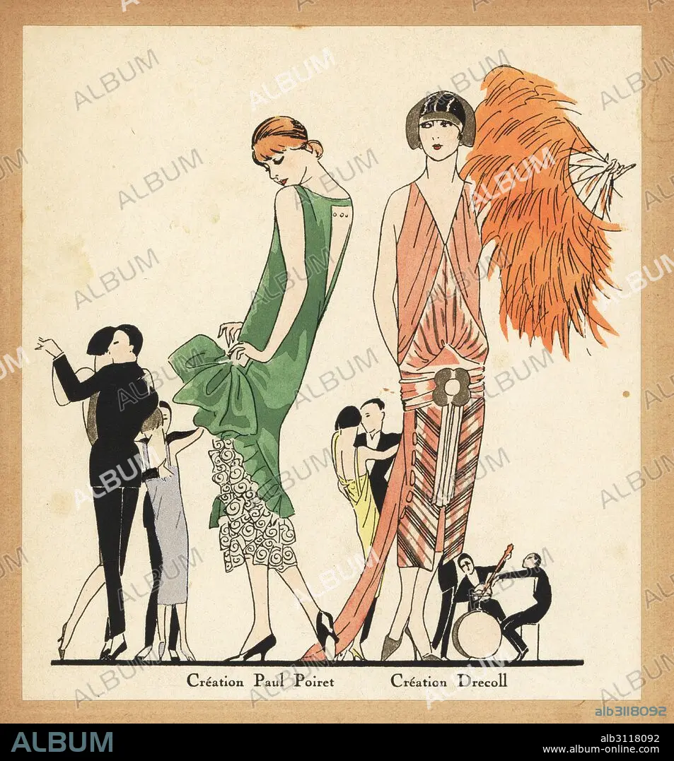 Women in evening dresses with frills and trains, at a jazz dance, Paris 1925. Handcolored pochoir (stencil) lithograph from the French luxury fashion magazine Art, Gout, Beaute, 1927.