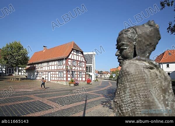 Museum of local history and blurred sculpture Sitting Soraya by Karlheinz Oswald 2017, half-timbered house, bronze, sitting, woman, Eschenplatz, Eschborn, Hesse, Germany, Europe