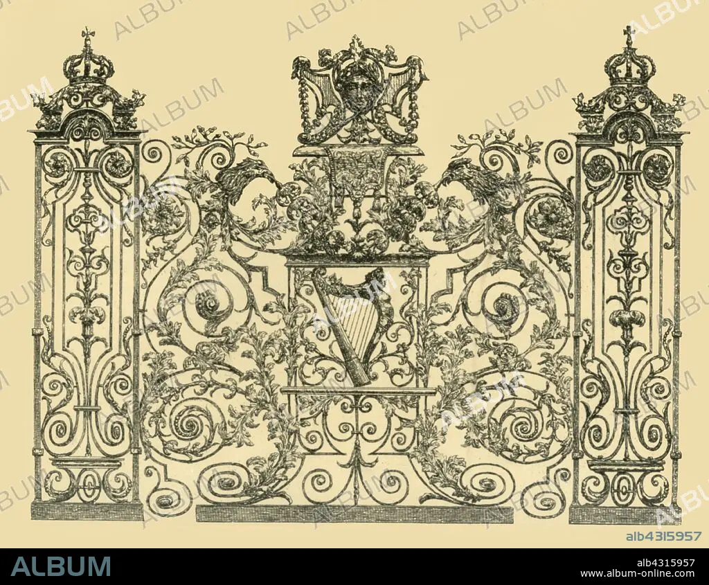Section of the Tijou Screen, late 17th century, (1881). Etching of one of the twelve sections of a wrought iron screen, designed c1690 by the Huguenot ironworker Jean Tijou for the gardens at Hampton Court Palace, (west London). The gardens were remodelled in the late 18th century by George III, and as there was no longer room for the screen, it was lent to the South Kensington Museum by Queen Victoria. It was later restored and returned to its original position at the end of the Privy Garden fronting the River Thames. From "The South Kensington Museum", a book of engraved illustrations, with descriptions, of the works of art in the collection of the Victoria & Albert Museum in London (formerly known as the South Kensington Museum). [Sampson Low, Marston, Searle and Rivington, London, 1881]