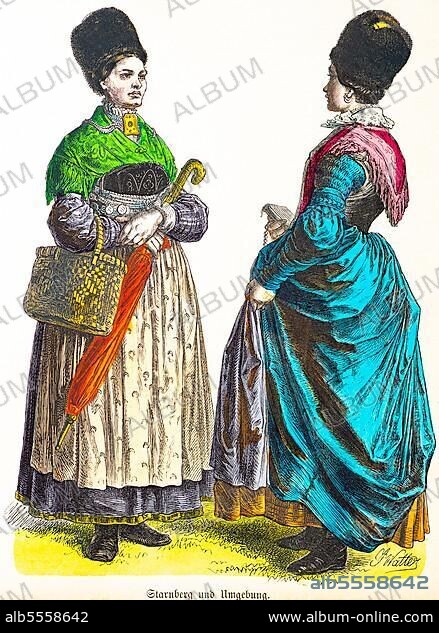 Munich picture sheet, costumes, Starnberg and surroundings, Bavaria, 19th century, traditional traditional costume, umbrella, basket, caps, two woman portrait, historical illustration 1890